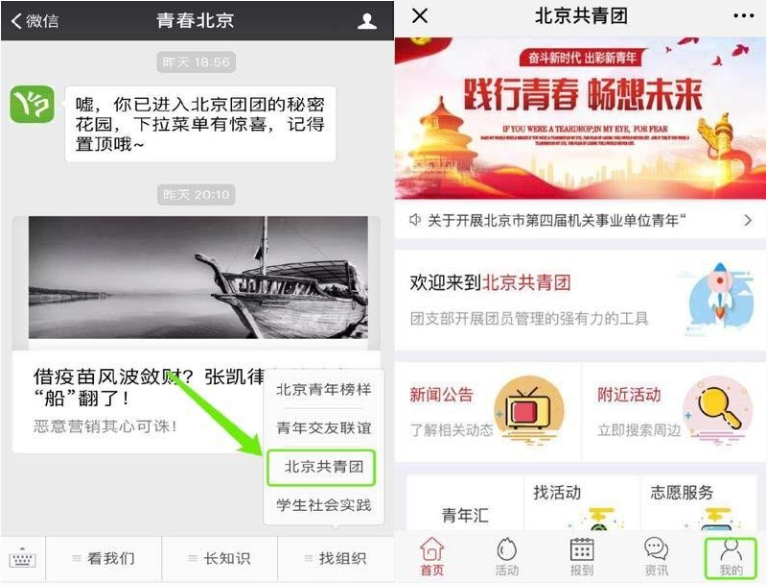 a)微信搜索“青春北京”公众号;点击“线上系统”中的“北京共青团系统”;